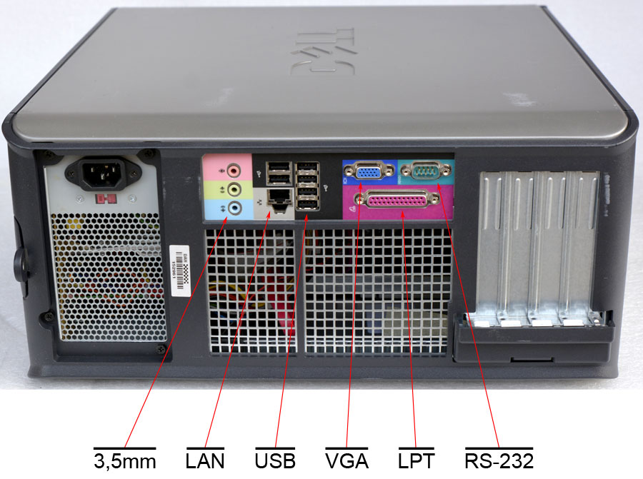 mit Intel Pentium 4 3,2GHz, 2GB RAM, 80GB SATA Festplatte; intern verfügt der Rechner noch über einen PCIe und zwei PCI Slots, extern finden sich neben mehreren USB Typ A noch LAN, RS-232, LPT und VGA, sowie jeweils ein DVD-ROM, ein DVD-RW und ein Floppy Laufwerk