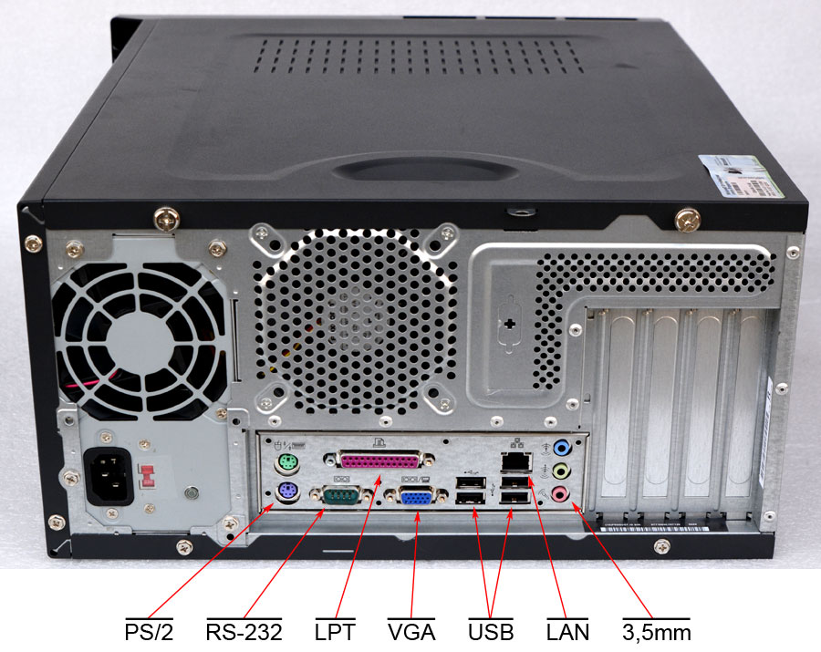mit Intel Pentium 4 3GHz, 2GB RAM, 160GB SATA Festplatte; extern finden sich neben mehreren USB Typ A noch LAN, RS-232, LPT und VGA