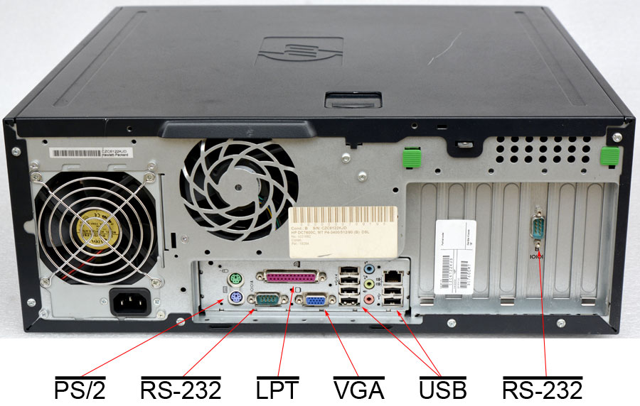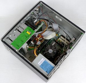 mit Intel Pentium 4 650 3,4GHz, 1GB RAM, 160GB SATA Festplatte; intern verfügt der Rechner noch über einen PCIe Slot und zwei PCI Slots, extern finden sich neben mehreren USB Typ A noch LAN, RS-232, LPT und VGA, sowie ein DVD-ROM und ein Floppy Laufwerk