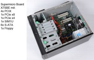 intern verfügt der Rechner noch über vier PCIX, einen PCIe x4, einen PCIe x8 und einen SIM1U Slot, sowie sechs S-ATA Anschlüsse