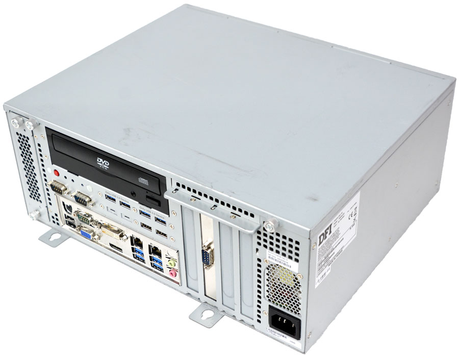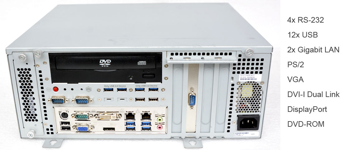 mit intel G3900 2.80 GHz Skylake (“Skylake-S”) LGA 1151 CPU, 4GB DDR4 RAM, 80GB S-ATA HDD Festplatte und DVD-ROM; extern finden sich neben zwölf USB Typ A Anschlüssen noch 2x Gigabit LAN, 4x RS-232, PS/2, VGA, DVI und DisplayPort