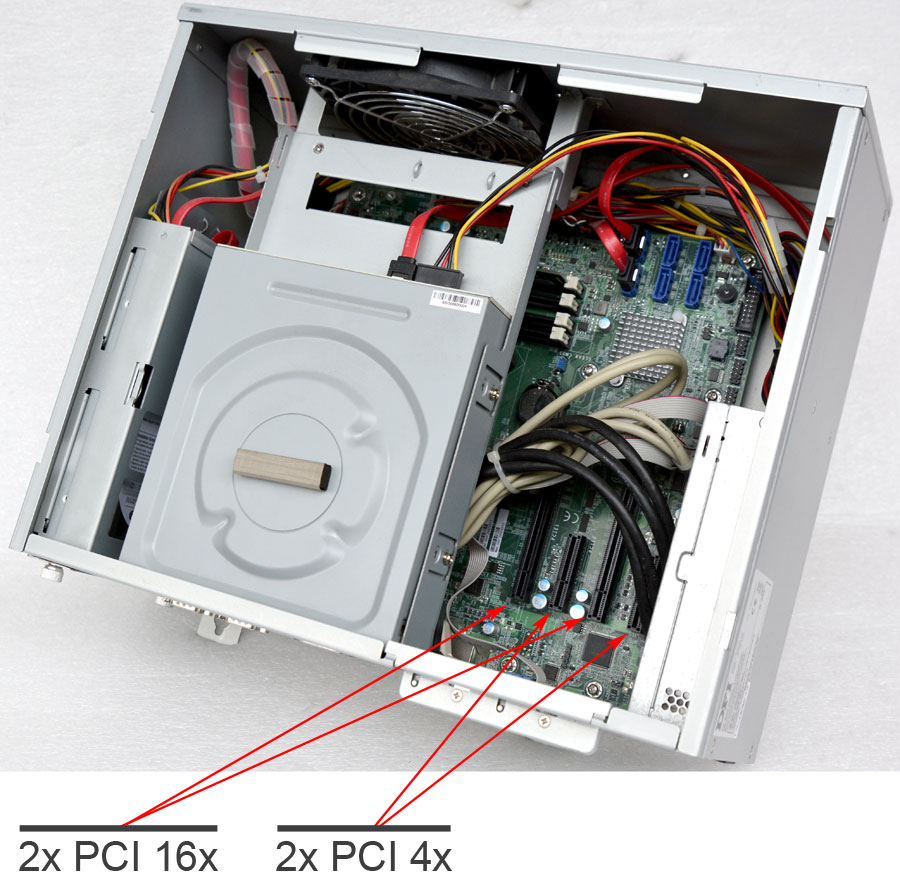 Intern verfügt der Rechner über 4x PCIe Slots(2x 4 Lanes und 2x 16 Lanes), 6x S-ATA Slots auf dem Mainboard(zwei davon sind belegt – inwiefern die vier anderen nutzbar sind ist eine Frage des Netzteils) und 4x S-ATA Stromanschlüsse.