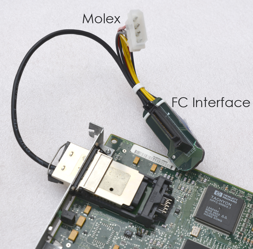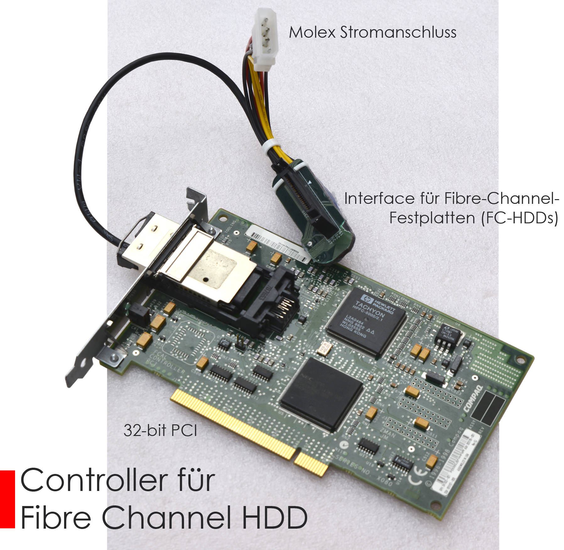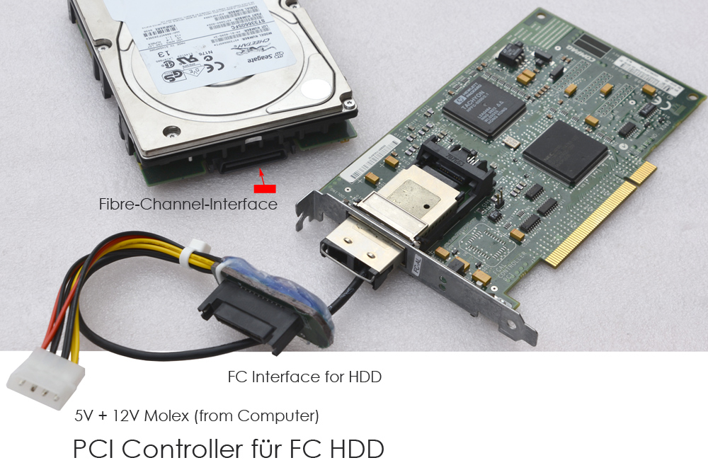 Es ist eine FC-Netzwerkkarte mit einem Adapter inklusive Elektronik, mit der Fibre-Channel-Festplatten (FC-HDDs) betrieben und formatiert werden können.