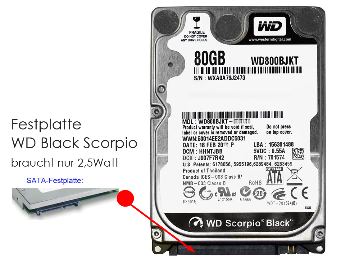 Modell: WD800BJKTKapazität: 80 GBFormfaktor: 2,5 Zoll (6,35cm)Schnittstelle: SATA II (3.0 Gbps) – kompatibel mit SATA-II und SATA-IIICache-Speicher: 16 MB