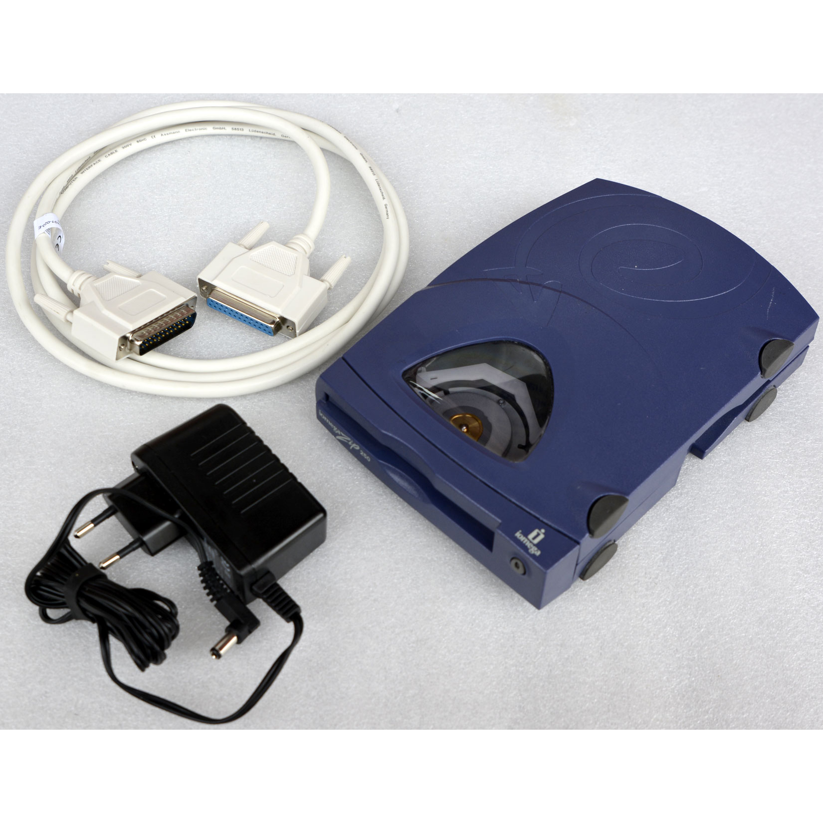 Externes ZIP-Laufwerk von Iomega für 250-MB-ZIP-Disketten, mit Parallel-Port-Anschluss (IEEE-1284). Ideal zum Auslesen/Archivieren älterer ZIP-Medien an PCs mit echtem Parallelport.