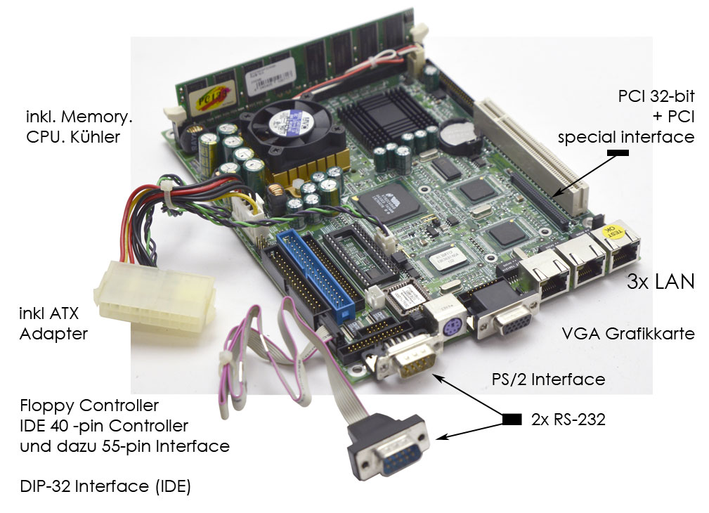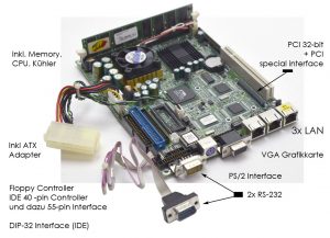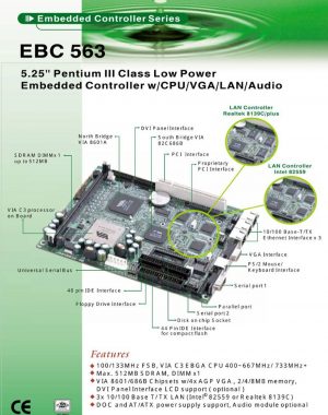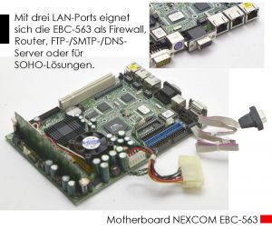 Mit drei LAN-Ports (Intel 82559/82559ER oder RTL8139C/C+) eignet sich die EBC-563 als Firewall, Router, FTP-/SMTP-/DNS-Server oder für SOHO-Lösungen. 2x RS-232, VGA, PS/2; Das Board beinhaltet einen Floppy Controller, einen IDE Controller mit 40/44-pin Interface, und noch einen IDE Controller, über den können Sie DOC Module mit DIP32 Interface beschreiben / kopieren.