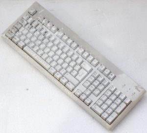 Farbe und Design: Klassisch beige-weiß, robustes Gehäuse, vermutlich 104/105 Tasten.