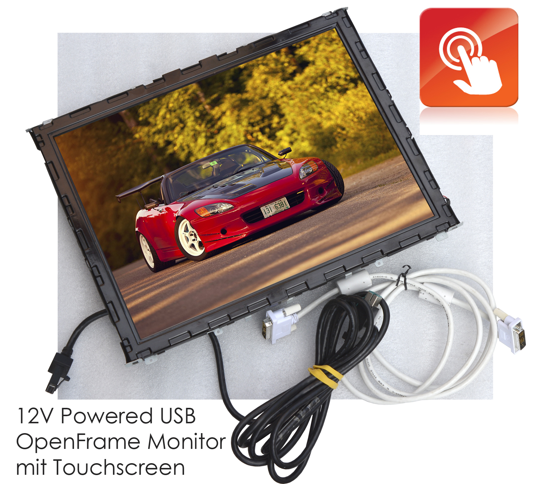 15″ (38 cm) Open Frame Industrie Monitor mit Infrarot-Touchscreen, 1024×768, Format 4:3, DVI, inkl. 12V Power-USB Kabel