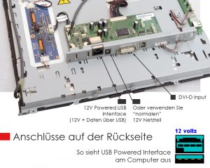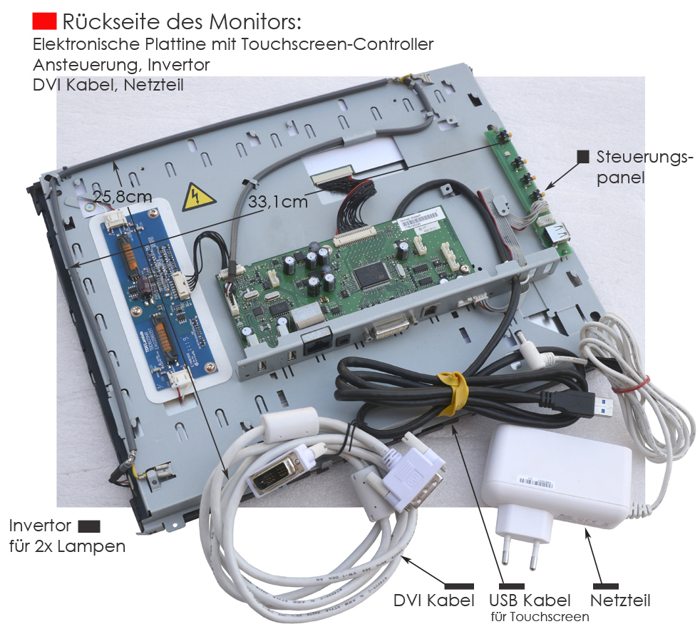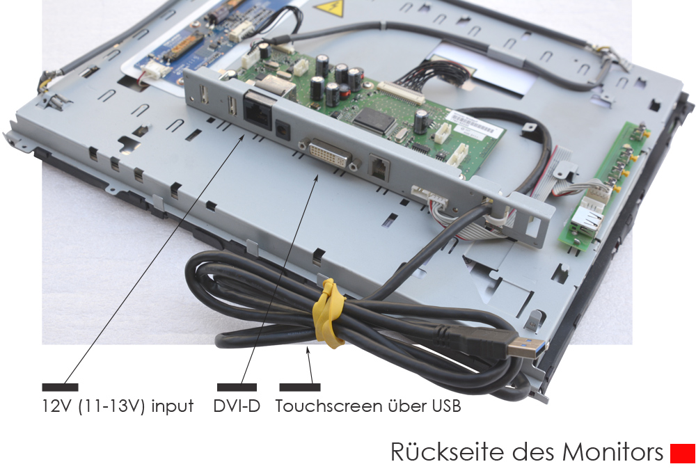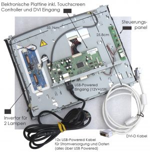 Lieferumfang: 15″ (38cm) Open Frame Industrie-Monitor mit Infrarot-Touchscreen, Power-USB Kabel (Strom + Daten), DVI Kabel