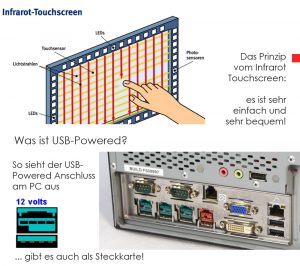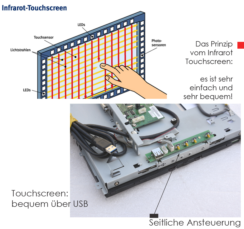 Ein Infrarot-Touchscreen arbeitet mit unsichtbaren Lichtstrahlen (IR-Licht) und erkennt jede Unterbrechung dieser Strahlen.