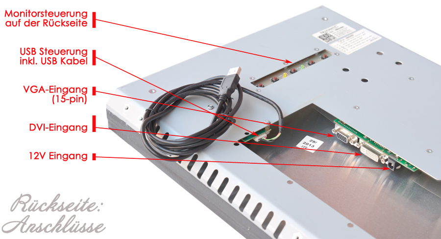 Ideal als Kundendisplay, Wandmonitor, Infoterminal. Steuerungspanel und Einschalttaste befinden sich auf der Rückseite und sind für den Nutzer nicht sichtbar. Dank 12V Stromversorgung kann der Monitor über 12V Akkus sowie im PKW, Wohnwagen oder auf einem Boot genutzt werden.