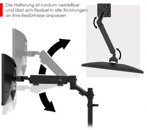 Ergonomische Anpassung: Neigbar (-25° bis +60°), schwenkbar (±90°) und drehbar (±90°) für optimalen Betrachtungskomfort.