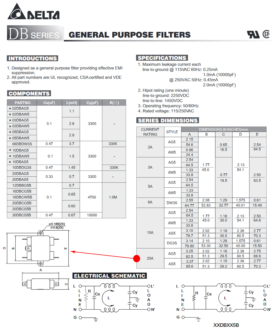 EMI Filter Delta 20DBAG5 115V 230V 250V Filter für Stromquelle bis 20A