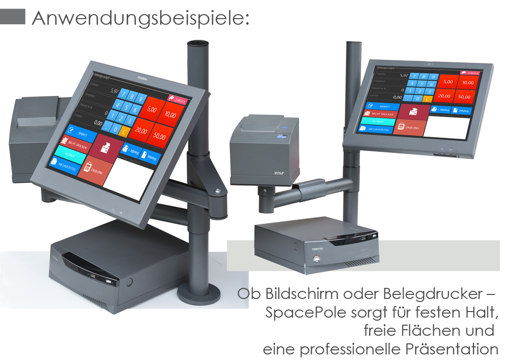 Zum Verkauf steht ein professioneller Monitorarm von SpacePole, Modell CONRAD001-05, ideal geeignet für den Einsatz im Einzelhandel, Büro oder an Arbeitsplätzen mit hohem Ergonomiebedarf. Der Monitorarm verfügt über zwei robuste Arme und eine zusätzliche Halterung für einen Drucker.