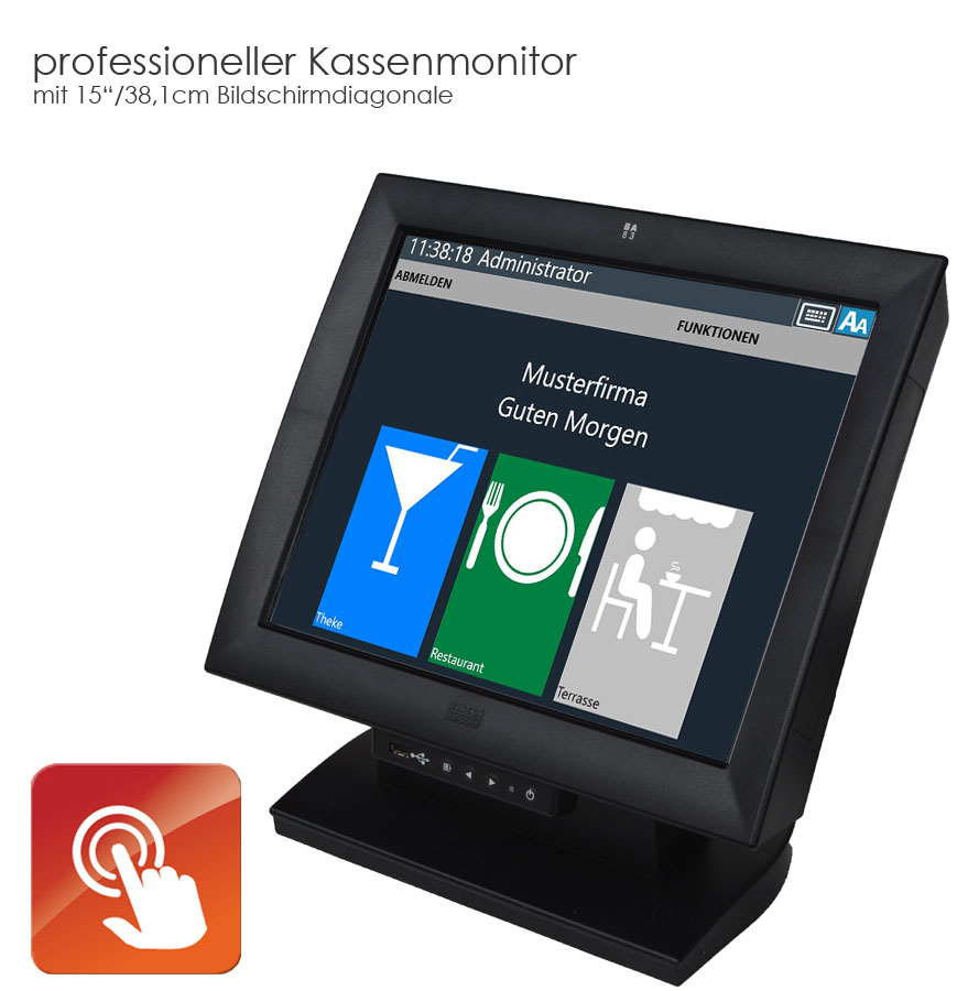 eine sehr schöne, moderne, kompakte Lösung für die Gastronomie (geeignet für ein Restaurant, eine Pizzeria, oder einen Imbiss etc), mit hochwertigem 15“ (38cm) Touchscreen Kassenmonitor mit einem USB Erweiterungsport vorne